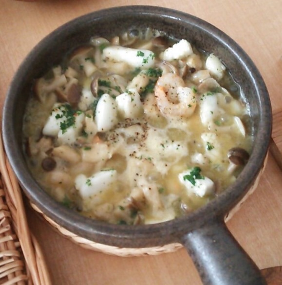 オリーブオイルとオーガニックのにんにくと鷹の爪を温めて、香りが立ったらしめじとシーフードを投入。
