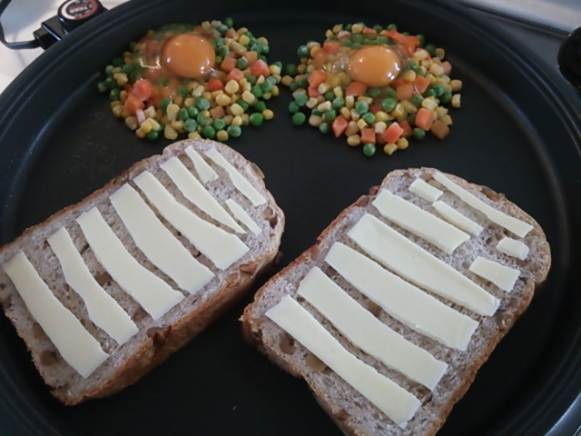 朝ごはんではチーズトーストと温野菜目玉焼きをオン。この付け合わせは、スープの具材になります。