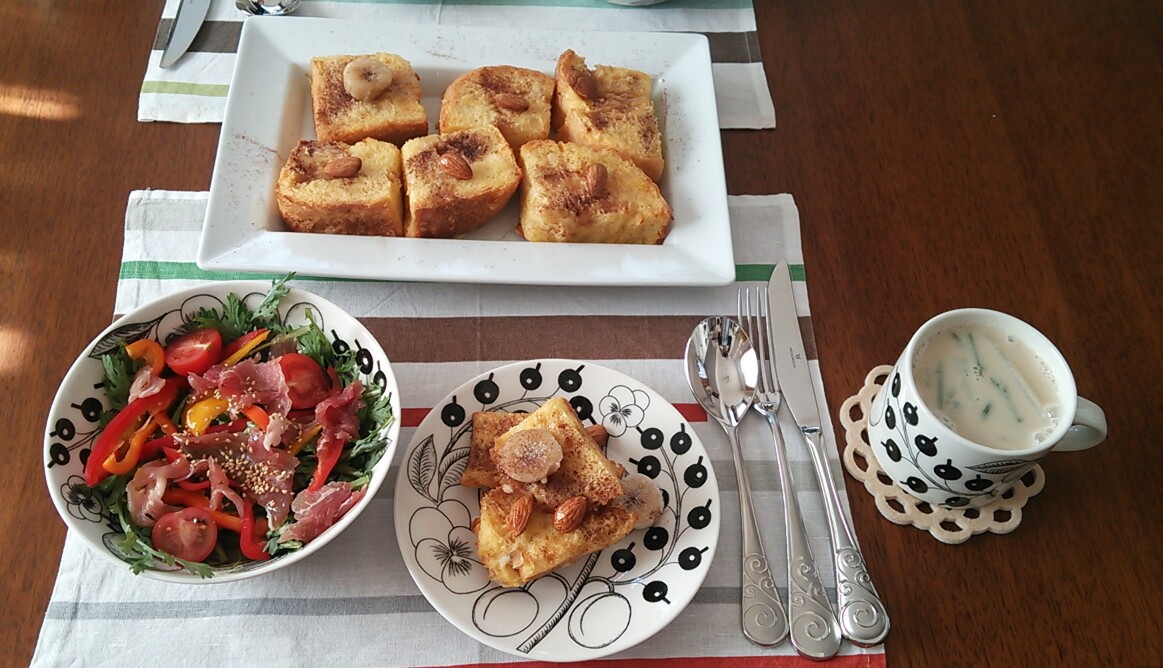 朝ごはんに、昨日のフランスパンをたまご液に浸して、フレンチトーストを作りました。