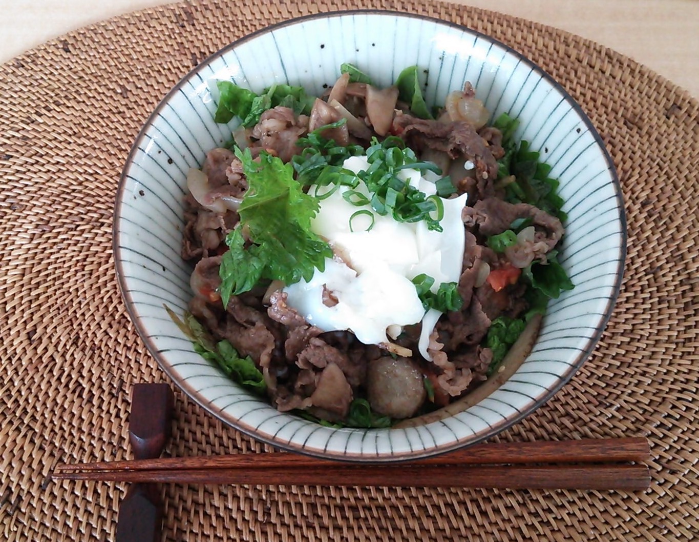 一緒に加熱したのでわかりにくいですが、ごはんの上にベビーリーフを、その上にゴボウと玉ねぎとしいたけとお肉を炒めてタレを絡めたものを載っけて温泉たまごを崩しながらいただきました。