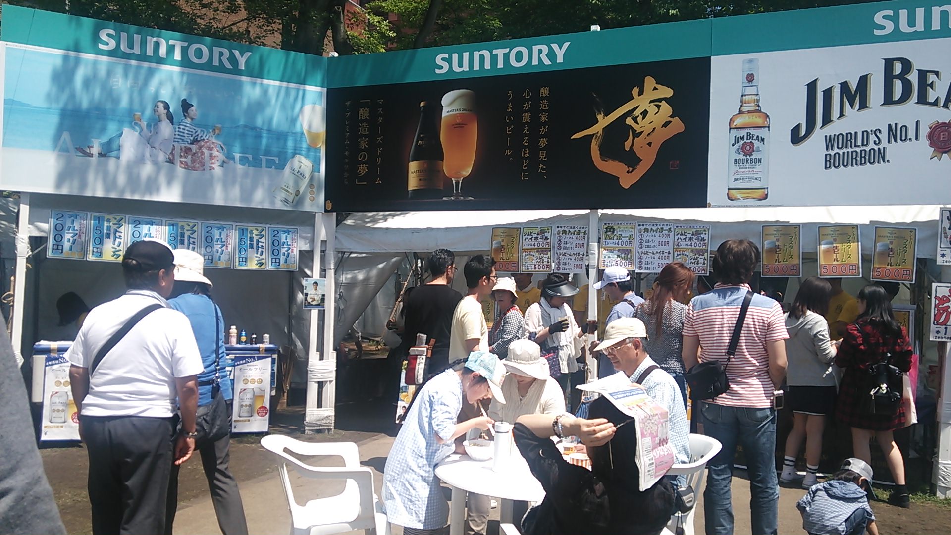 汁なし担々麺や焼き鳥にノンあるビール。テントのベンチで。このチープさがお祭りっぽくっていいでしょう?