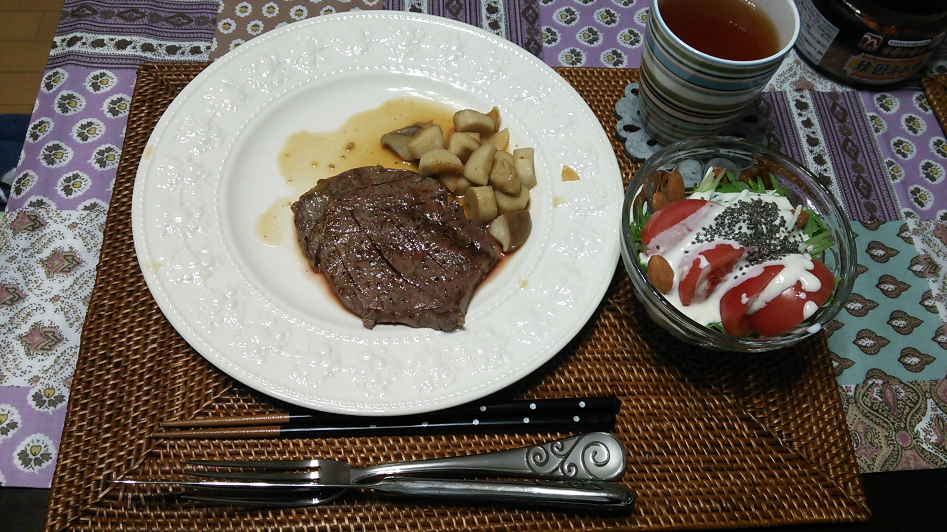 夜は運動のご褒美にステーキを。赤身のお肉でヘルシーに。