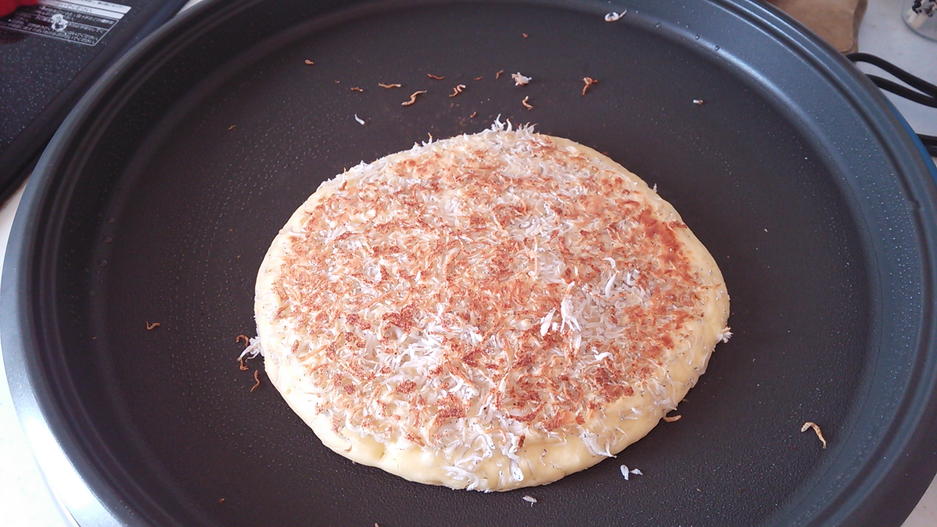 パンケーキの生地の片面にしらすやちりめんじゃこをパラパラと(かなり多量に)振りかけ焼き上げます。カリカリ食感が良い感じ♪