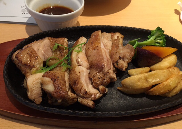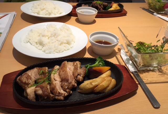 ランチメニューは、パスタやオムライス、サラダ大盛りプレートなどがあったのですが、肉体疲労気味の我が家は、ステーキとローストチキンをオーダー。