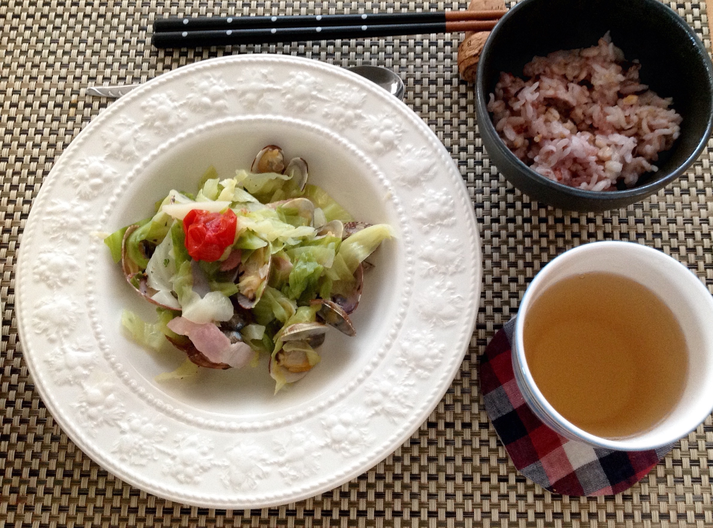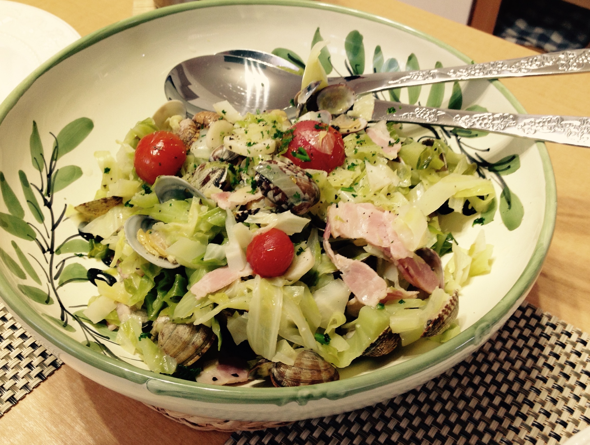 夜はアサリと春キャベツのスチーム。ベーコンとトマトも投入。オリーブオイルとニンニクとお酒で蒸しあげるという超カンタンメニューです。