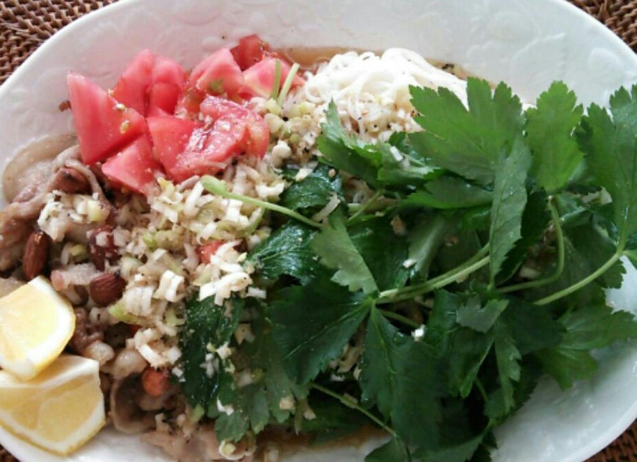 香ばしく炒ったナッツもパラパラ。仕上げにレモンとラー油を振りかけます。