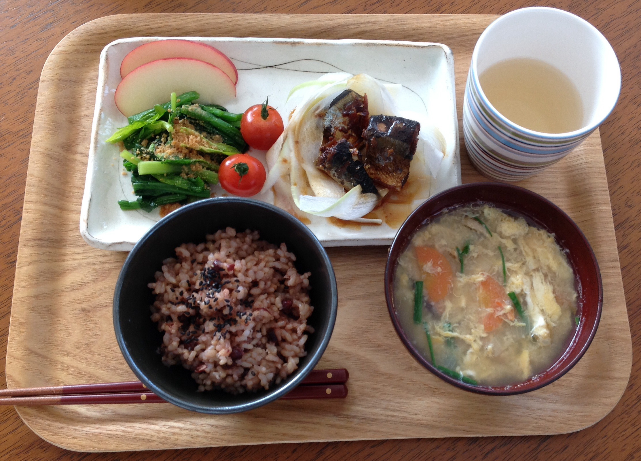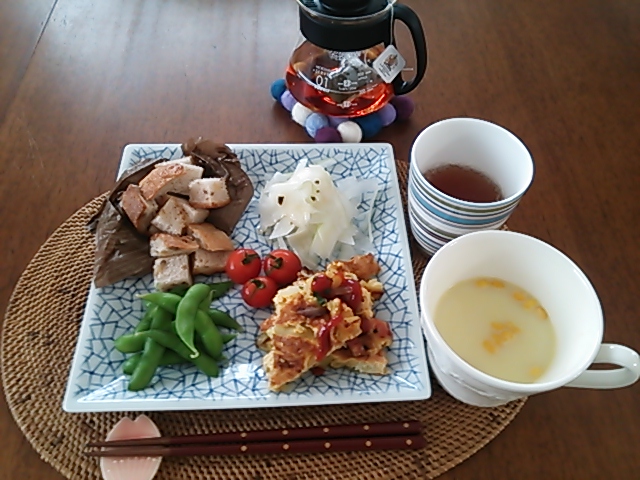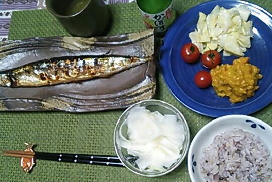 我が家ごはん、朝は昨日のうまいもの市で買ったさんまの黒酢煮ほか。