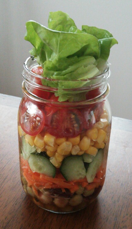 昨日仕込んだジャーサラダを付け合わせに。メイソンジャーは売り切れているので、ラッキョウの入っていた瓶(笑)で…