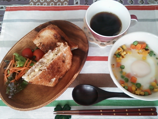 朝ごはんではチーズトーストと温野菜目玉焼きをオン。この付け合わせは、スープの具材になります。