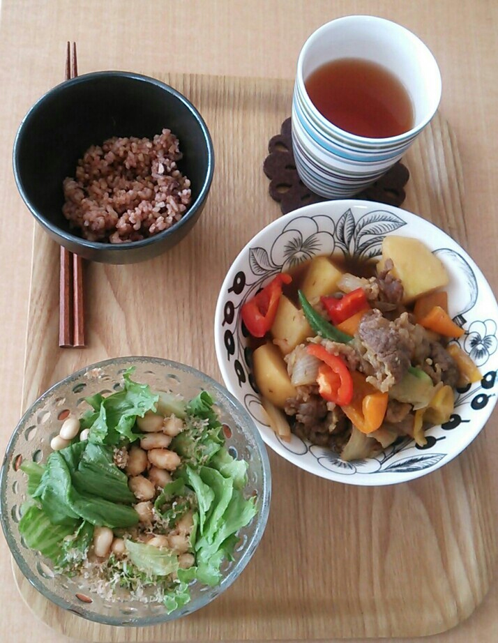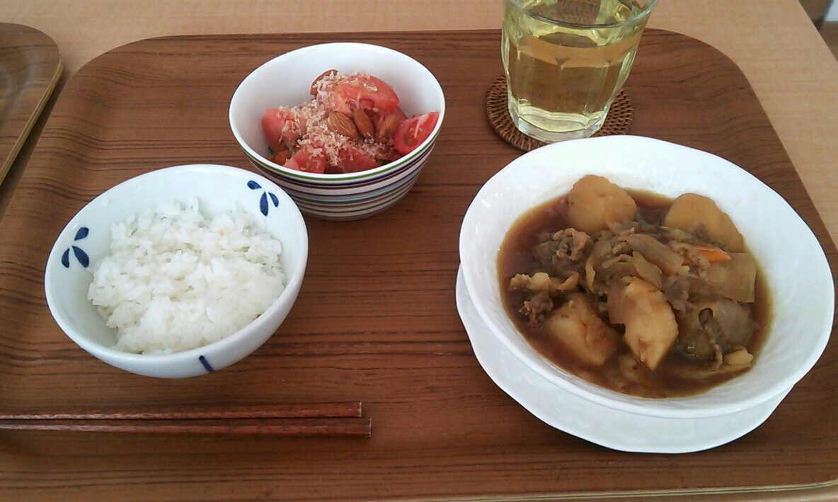お昼はカレー風味の夏野菜の肉じゃが。